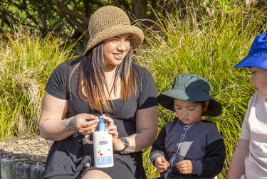 Left: Marquees are available for your events | Top right: Whānau applying sunscreen | Bottom right: Kid filling up their drink bottle